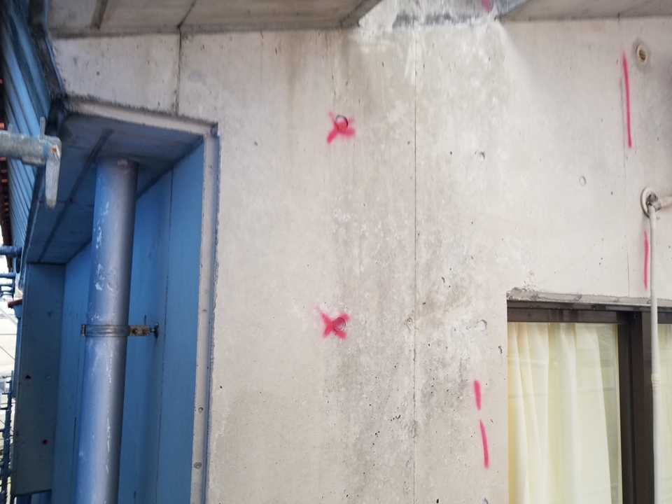 足場組立後、打診調査マーキング処理