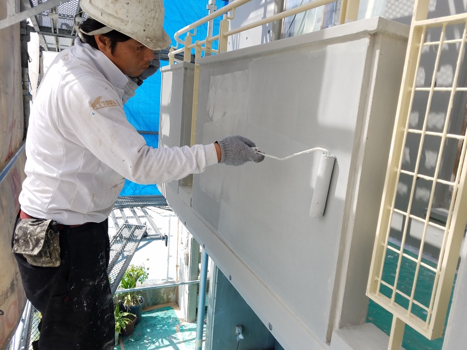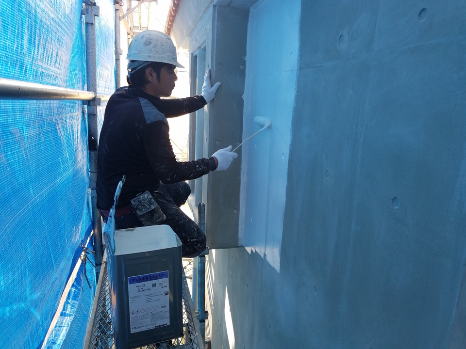 水性エポキシ樹脂塗料を下塗りに用いることで、下地を隠ぺいし、密着性に優れた仕様となっています。